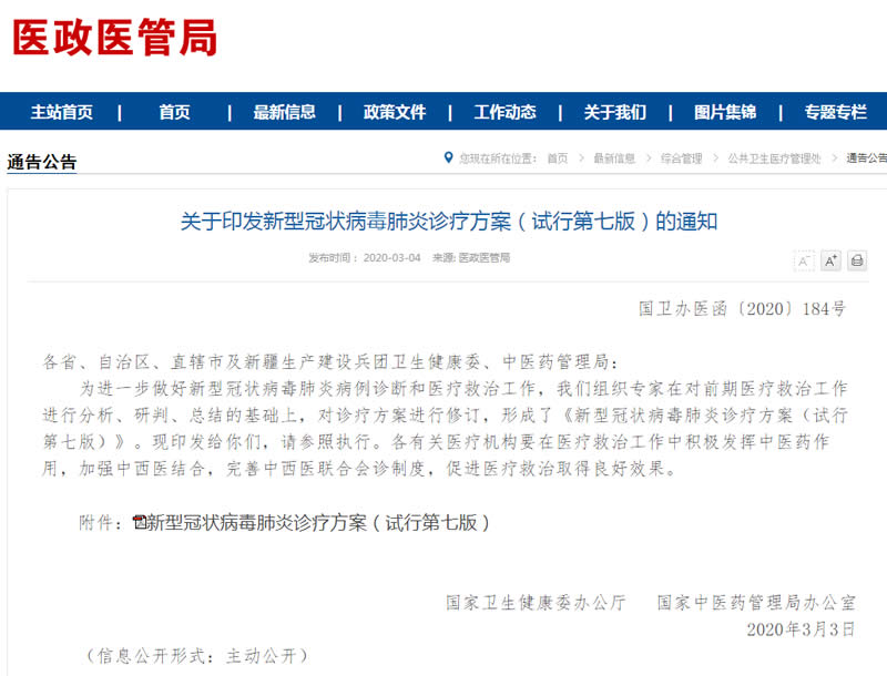 為進一步做好新型G狀病毒肺炎病例診斷和醫療救治工作,我們組織專家在對前期醫療救治工作進行分析、研判、總結的基礎上,對診療方案進行修訂,形成了《新型G狀病毒肺炎診療方案(試行第七版)》,F印發給你們,請參照執行。各有關醫療機構要在醫療救治工作中積J發揮中醫藥作用,加強中西醫結合,完善中西醫聯合會診制度,促進醫療救治取得良好效果。