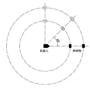 D. 將障礙物放置在相對(duì)于機(jī)器人的視線逆時(shí)針45°方向的直線上,重復(fù)步驟B和C。每次測(cè)量完成后,逆時(shí)針增加45°角,重復(fù)步驟D。當(dāng)機(jī)器人到達(dá)初始位置時(shí),程序停止。調(diào)整障礙物的方向,使其大的一面面向機(jī)器人。通過移動(dòng)機(jī)器人代替障礙物,可以實(shí)現(xiàn)障礙物的相對(duì)定位。