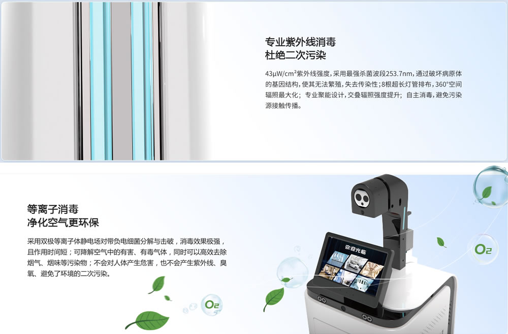 空氣消毒機(jī)器人使用等離子消毒,紫外線消毒,地面消毒和霧化消毒等方式殺滅空氣中的病毒,可以應(yīng)用在房間 大廳等場(chǎng)景