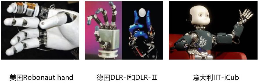 2) 德國宇航中心先后研制成功了 DLR-Ⅰ和 DLR-Ⅱ靈巧手,共集成了 25 個(gè)傳感器, 包括類似人工皮膚的觸覺傳感器、關(guān)節(jié)扭矩傳感器、位置傳感器和溫度傳感器 等,靈巧手在靈活性和感知能力方面有顯著提升。